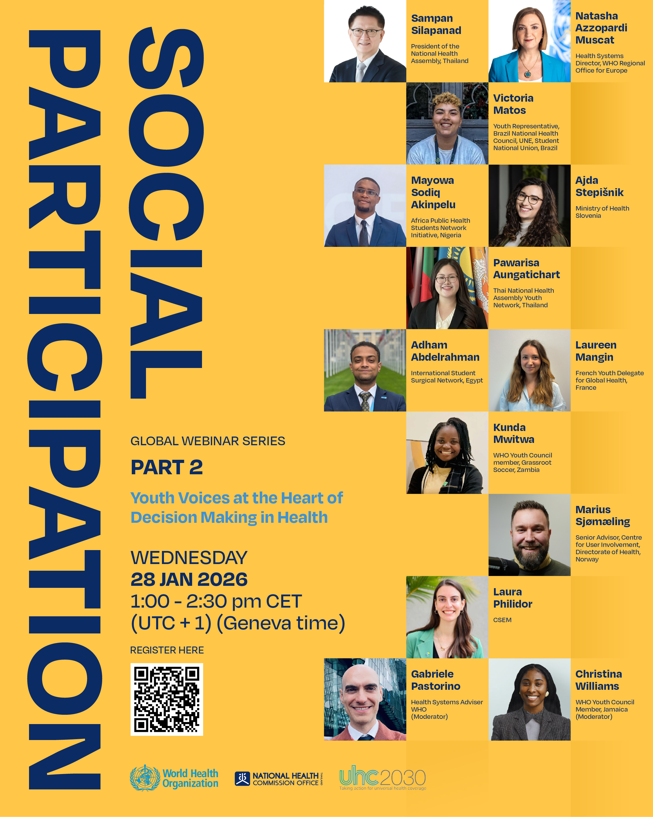 - The first webinar in this series took place on Thursday 18th September, 2025, 13:00-14:30 CEST,entitle Institutionalising Social Participation for Health, in advance of the United Nations General Assembly (UNGA).